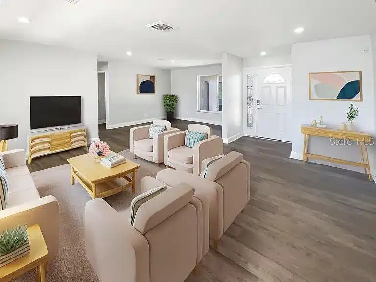 Fantastic single-family home in the desirable Holiday Groves neighborhood of Largo. This 1,814 sq ft home (per MLS) offers 3 bedrooms and 2 full bathrooms with fresh interior paint, a bright neutral palette, tile flooring throughout, a stylish kitchen backsplash, and a serene primary suite with ample under-sink storage. The home also includes laundry in the garage, an oversized driveway, an attached 2-car garage, and a fenced backyard with a sitting area perfect for BBQs and outdoor relaxation.