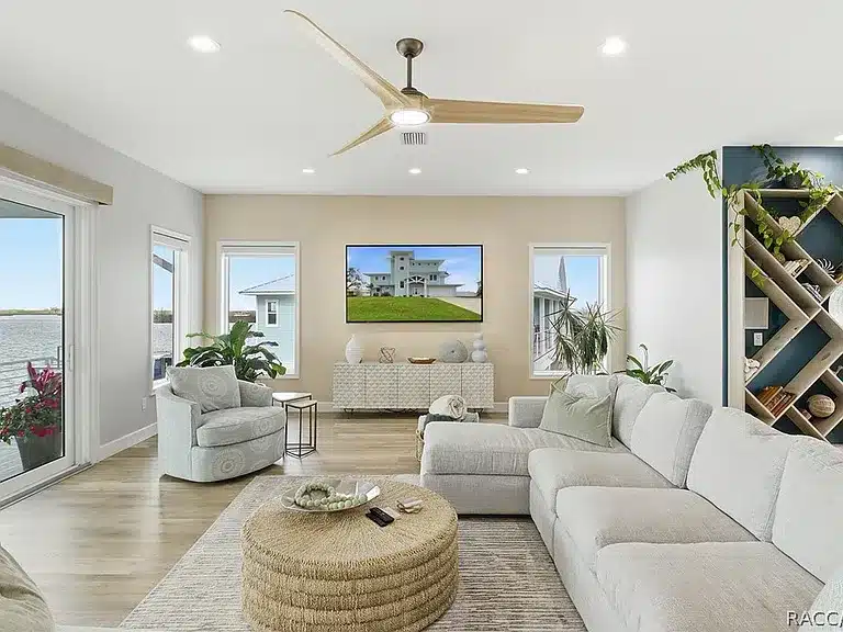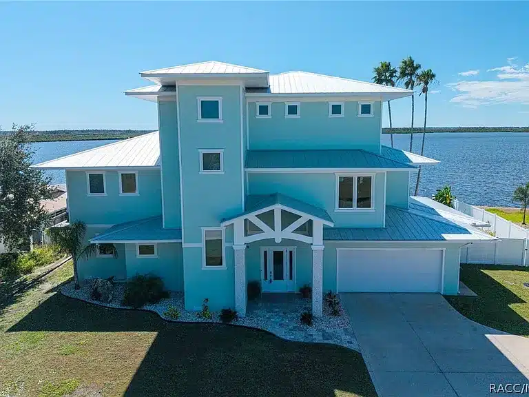 Exquisite design executed to perfection! Elegant waterfront pool home built in 2022. . . truly maximizes the unlimited views directly on Dixie Bay and Salt River within 15 minutes of the Gulf. This fabulous 3 story home has over 4200 square feet of luxury living, with an elevator to go to all three floors. The ground floor features a spacious garage, storage for toys and fishing equipment and a large game room with mini split AC. The main living area is upstairs with fabulous waterfront views of Dixie Bay