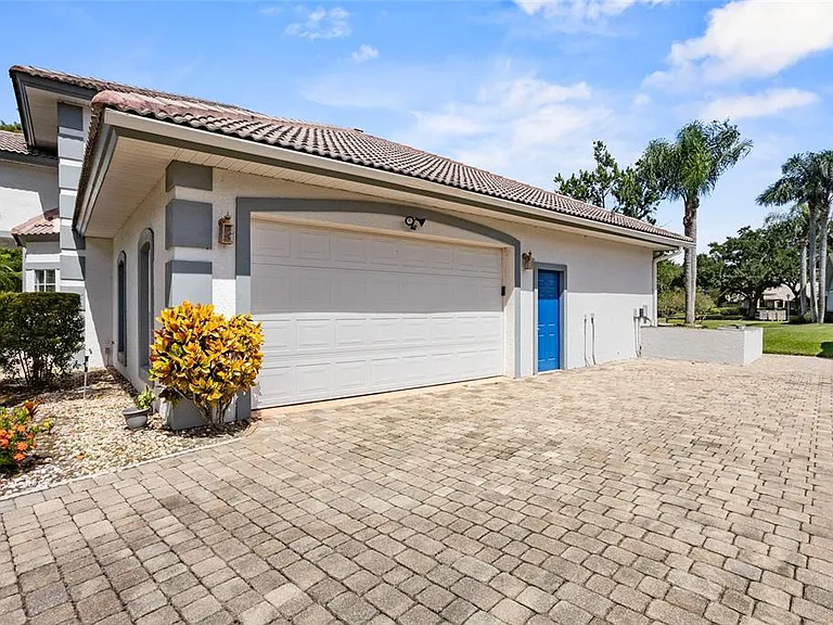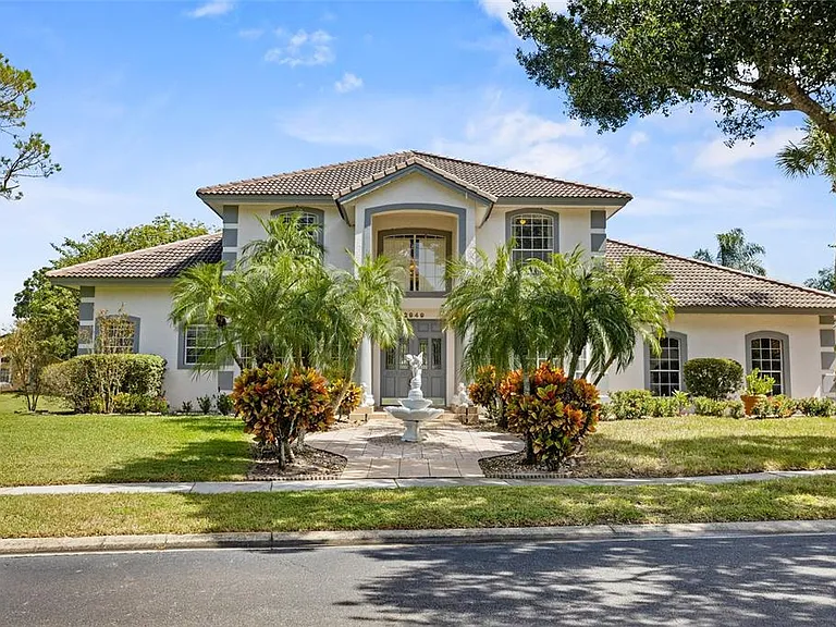 Extra Details: Waterfront lot with pond view, screened lanai/patio, private pool & spa, outdoor kitchen setup, block/concrete-stucco construction, tile roof, mature landscaping, access to gated-community amenities.