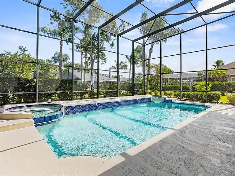 Spacious two-story home with 4 bedrooms and 2.5 bathrooms in a gated community. Features include a first-floor primary suite, a large family room with fireplace, a generous kitchen with granite counters and island, and an enclosed screened patio and lanai that leads to a private pool and spa. The property backs onto a pond — offering a calm waterfront view — and sits on a nearly 0.29-acre lot with mature landscaping; community amenities include clubhouse, tennis/pickleball, trails, and gated security. listed by ashely yates realty