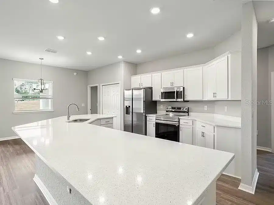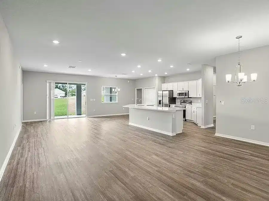 Under Construction. New construction home with 2536 square feet on one-story including 5 bedrooms, 3 baths, and an open living area. Enjoy an open kitchen with Samsung stainless steel appliances, a walk-in pantry, and a spacious breakfast bar, fully open to the dining café and gathering room. The kitchen, living area, laundry room, and baths include luxury wood vinyl plank flooring, with stain-resistant carpet in the bedrooms. Your owner’s suite is complete with a walk-in wardrobe and a private en-suite bath with dual vanities, a tiled shower, garden tub and a closeted toilet. Plus, enjoy a covered lanai, 3-car garage. Custom-fit window blinds, architectural shingles, energy-efficient insulation and windows, and a full builder warranty. “Please note, virtual tour/photos showcases the home layout; colors and design options in actual home for sale may differ. Furnishings and décor do not convey.