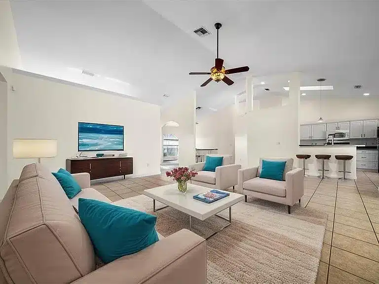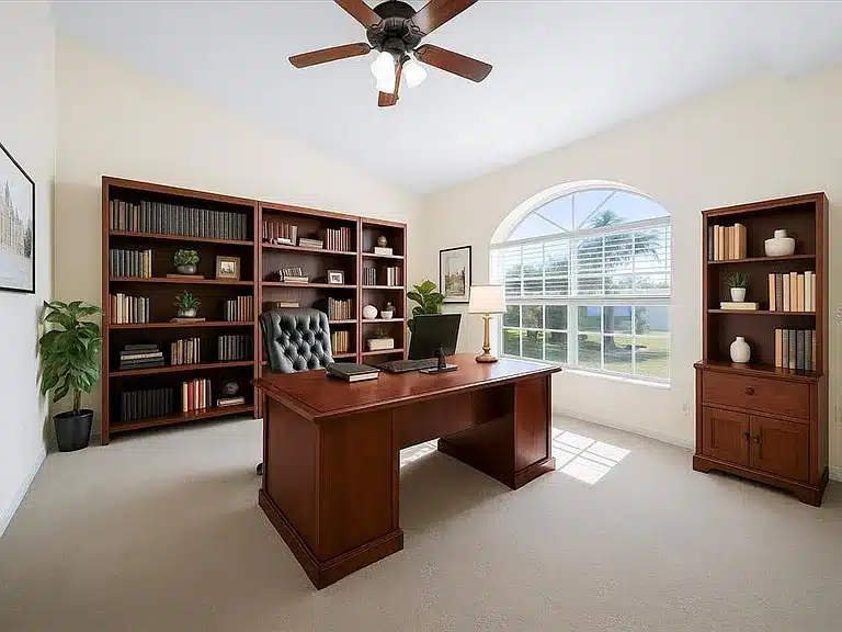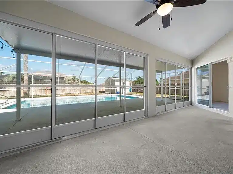 Extra Details: Vaulted ceilings, French pocket‑door office, 3‑season lanai, saltwater pool, privacy fence, storage shed